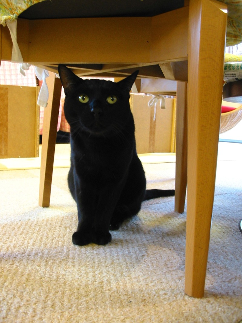 椅子の下で控えめに、「おやつもうないの?」な表情。