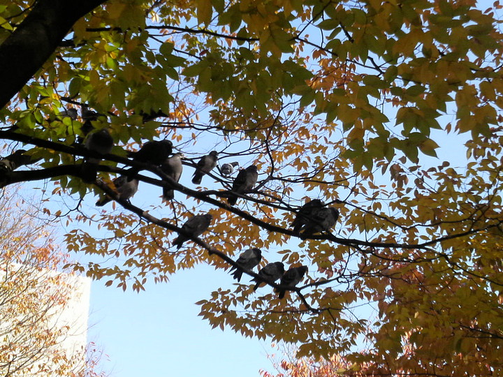 赤くならないまま葉が落ちているなあ、と見上げたら、鳩の群れ。