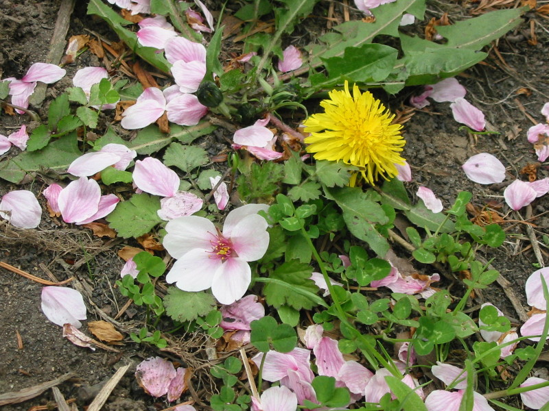 昔はクローバーが敷き詰められた状態で、タンポポの花輪を作ったり、オオバコ相撲をしたりしたのですが、今は半分砂利、その中でたくましくぺんぺん草とタンポポとホトケノザが点在。