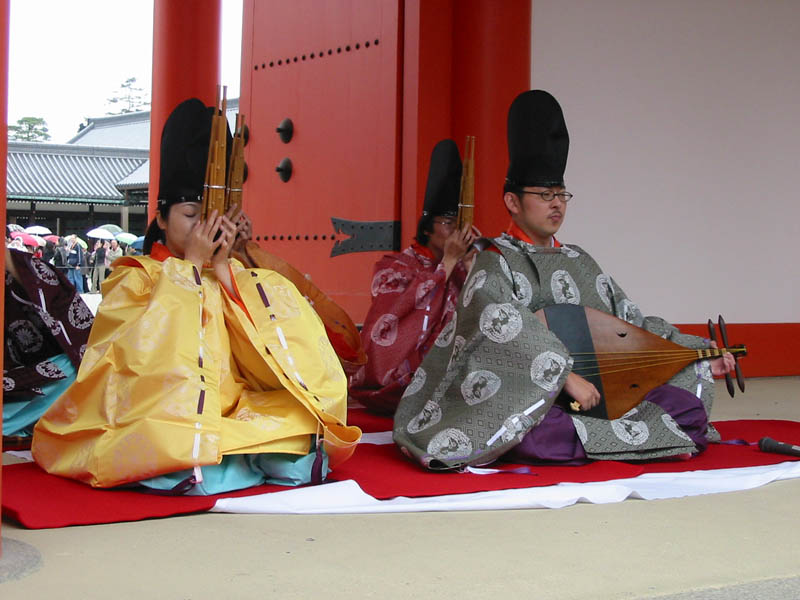どこかの神社に所属する団体さんのようで、プロではないらしく、迫力ある演奏、とは言い難かったけれど、古来の衣装での生演奏はやっぱり素敵でした。