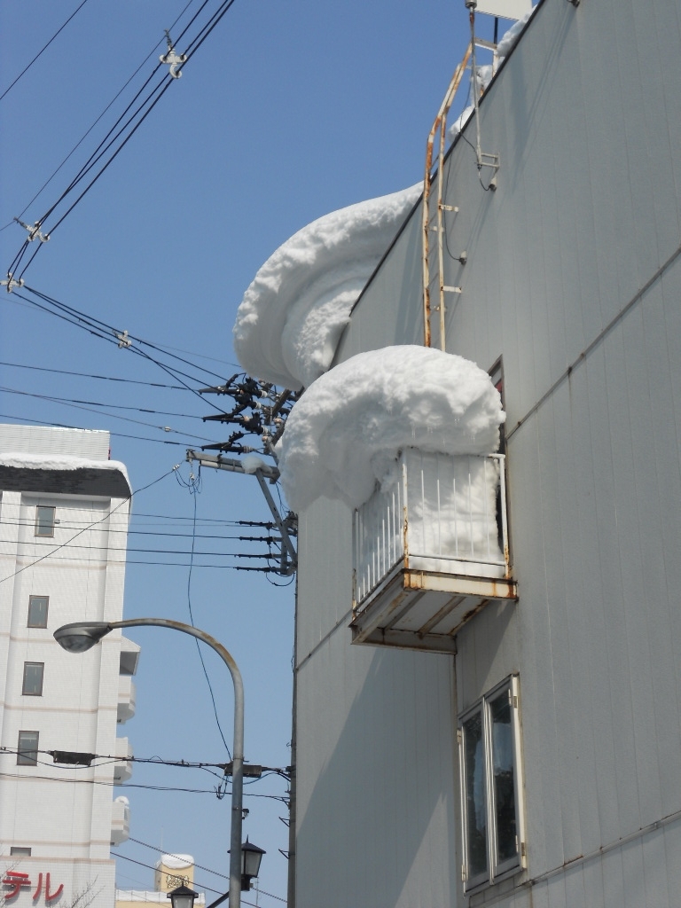 宿泊施設のそばの、3階建てぐらいの店舗のような建物で、オジサマが3人がかりでなが~いさすまたにロープを張ったような器具で屋根の雪を書き落とそうと奮闘。