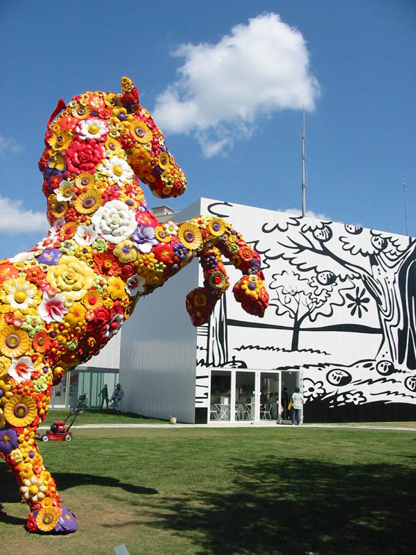 Flower Horseと、外壁も中のカフェの床も作品な建物。